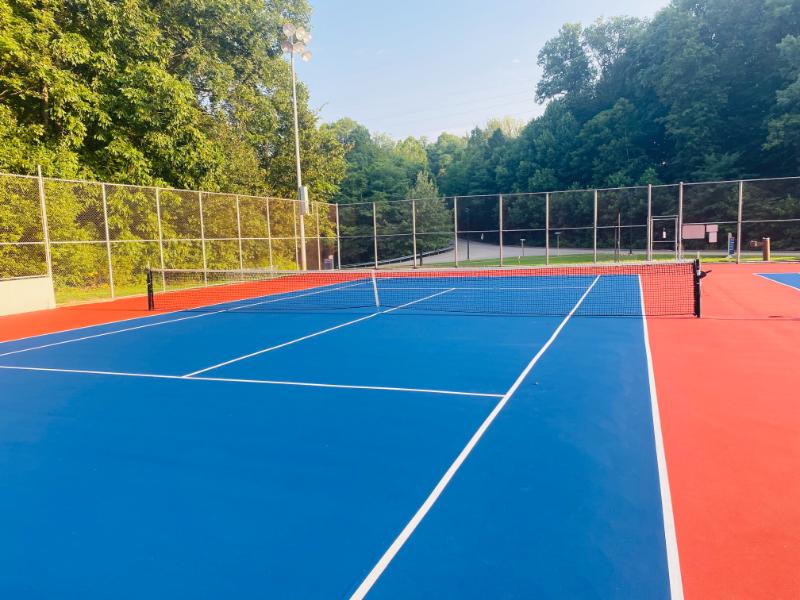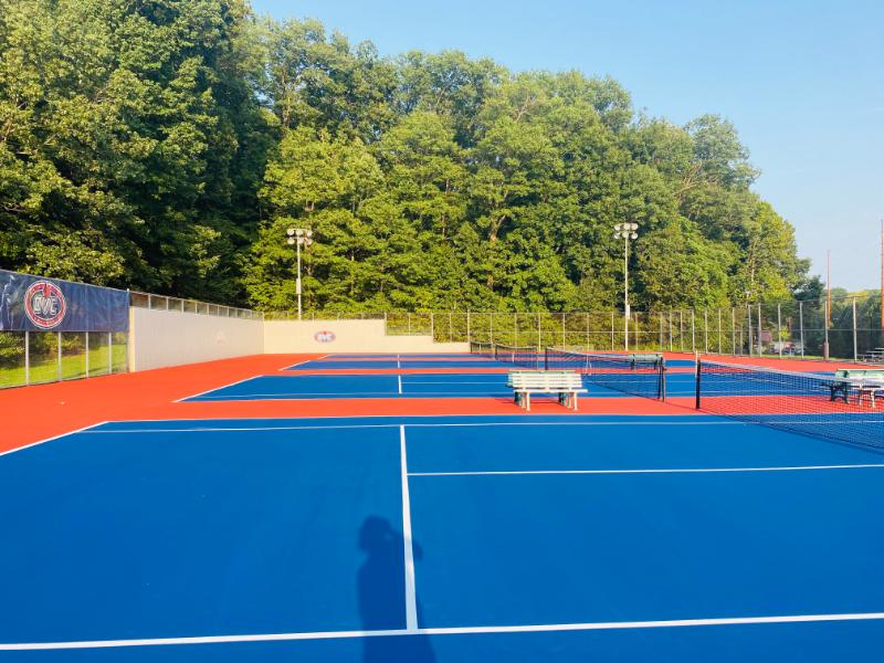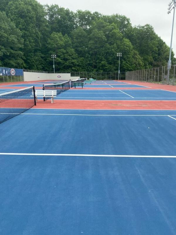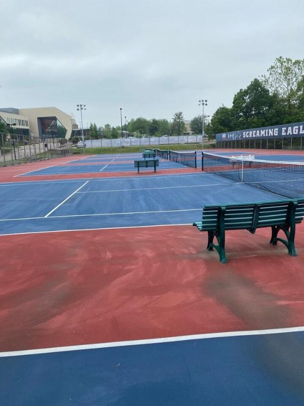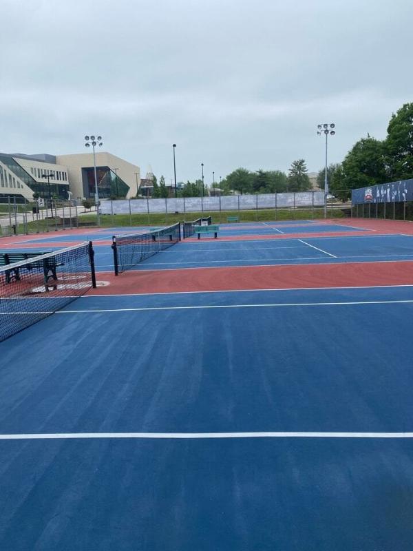 To revitalize the USI Screaming Eagles' tennis courts, Pro Track and Tennis meticulously repaired cracks, smoothed out rust spots, and addressed bird bath damage. The courts were then thoroughly cleaned and prepared for a fresh coat of paint. Two vibrant color coats were applied, followed by precise striping for six tennis courts. This comprehensive approach has transformed the courts into a professional-grade facility, ensuring optimal performance and a visually appealing playing experience for years to come.
